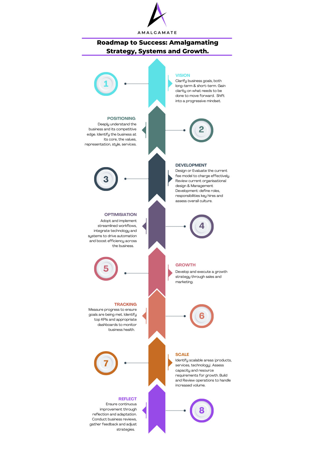 At Amalgamate, we’ve crafted a clear, structured framework to help guide you through the steps and transitions of business growth. We understand every business is unique and has their own individual challenges, so You’ll move at your own pace. We will hone in on the challenges that are most important to you, with us right by your side every step of the way!